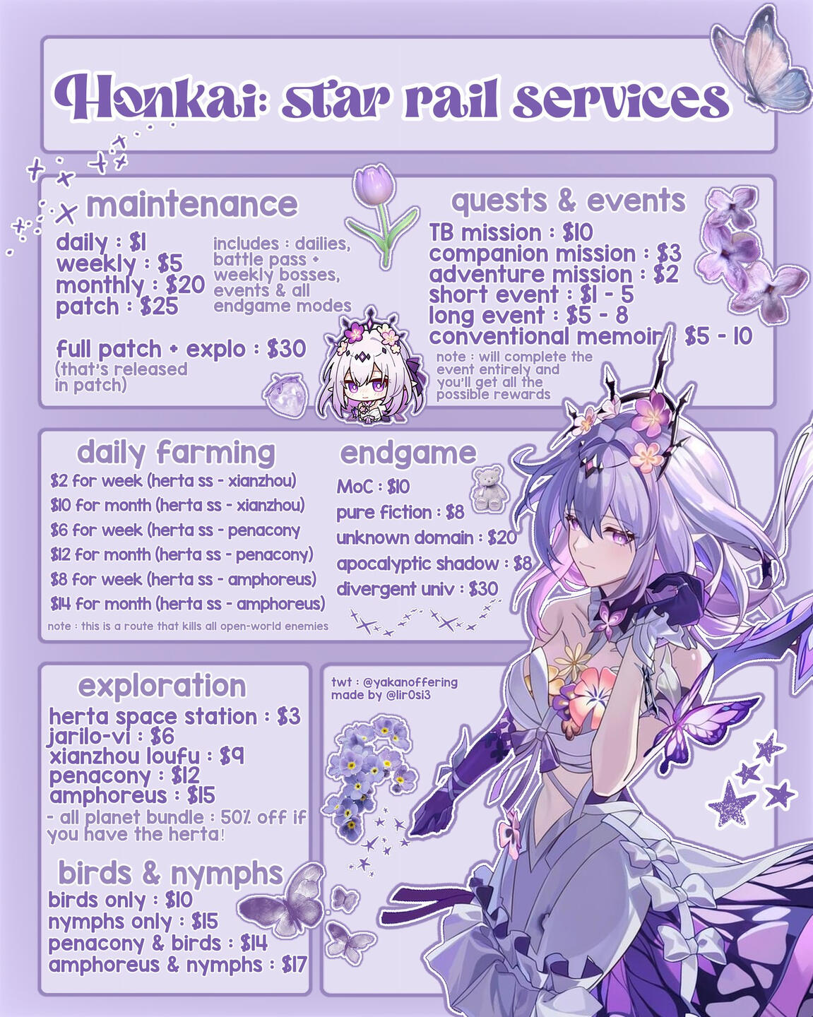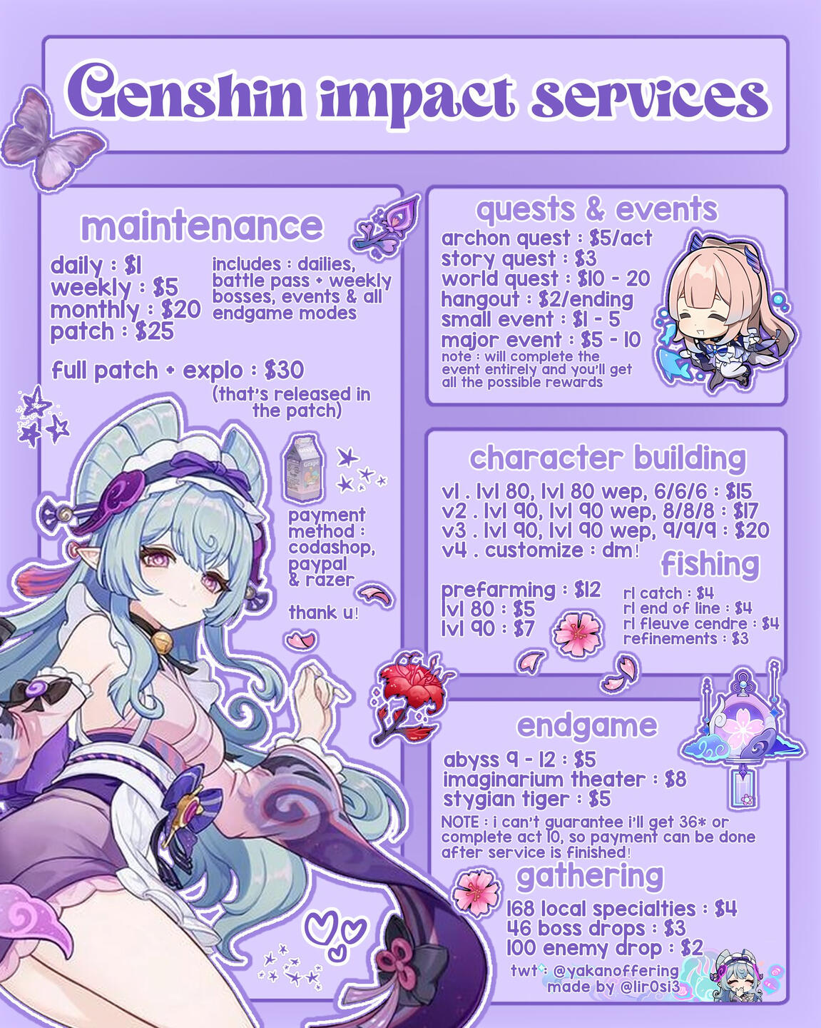 i offer a variety of services for both Genshin Impact! & Honkai: Star Rail! If there are services you would like to request but do not see on the form, let me know!